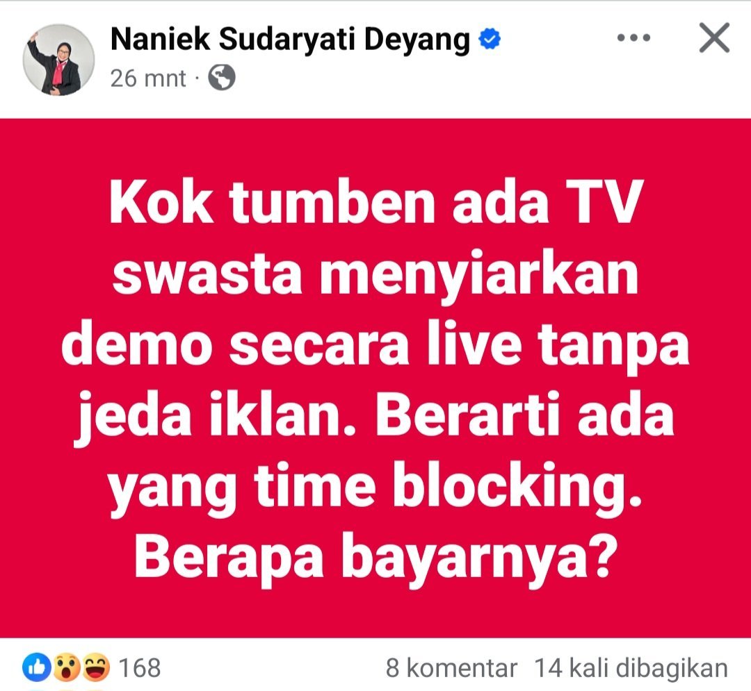 “Kok tumben ada TV swasta menyiarkan demo secara live tanpa jeda iklan. Berarti ada yang time blocking. Berapa bayarnya?” tulis Naniek S Deyang di akun fbnya, Senin (25/8/2025).