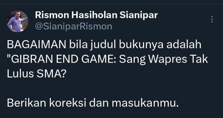 “BAGAIMANA bila judul bukunya adalah “GIBRAN END GAME: Sang Wapres Tak Lulus SMA? Berikan koreksi dan masukanmu,” kata Rismon di media sosial X.