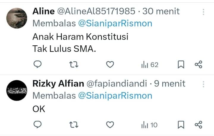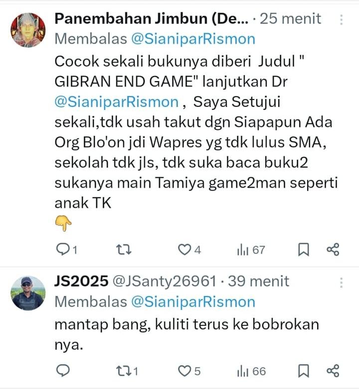 “Cocok sekali bukunya diberi Judul ” GIBRAN END GAME” lanjutkan Dr @SianiparRismon, Saya Setujui sekali, tdk usah takut dgn Siapapun Ada Org Blo’on jdi Wapres yg tdk lulus SMA, sekolah tdk jls, tdk suka baca buku2 sukanya main Tamiya game2man seperti anak TK,” komen akun X @BiruBir26073179.