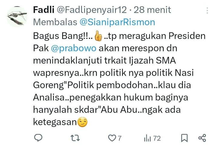 “Bagus Bang!!..👍..tp meragukan Presiden Pak @prabowo akan merespon dan menindaklanjuti terkait Ijazah SMA wapresnya.. krn politik nya politik Nasi Goreng “Politik pembodohan..klau dia Analisa..penegakkan hukum baginya hanyalah skdar” Abu Abu..ngak ada ketegasan😏,” komen akun X @Fadlipenyair12.