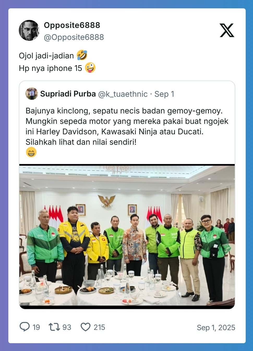 Ketua Umum Asosiasi Pengemudi Ojek Online (ojol) Garda Indonesia Raden Igun Wicaksono menyatakan para pengemudi beratribut ojol yang bertemu Wakil Presiden Gibran Rakabuming Raka di Istana Wakil Presiden, Minggu (31/8/2025), bukan bagian dari asosiasinya.