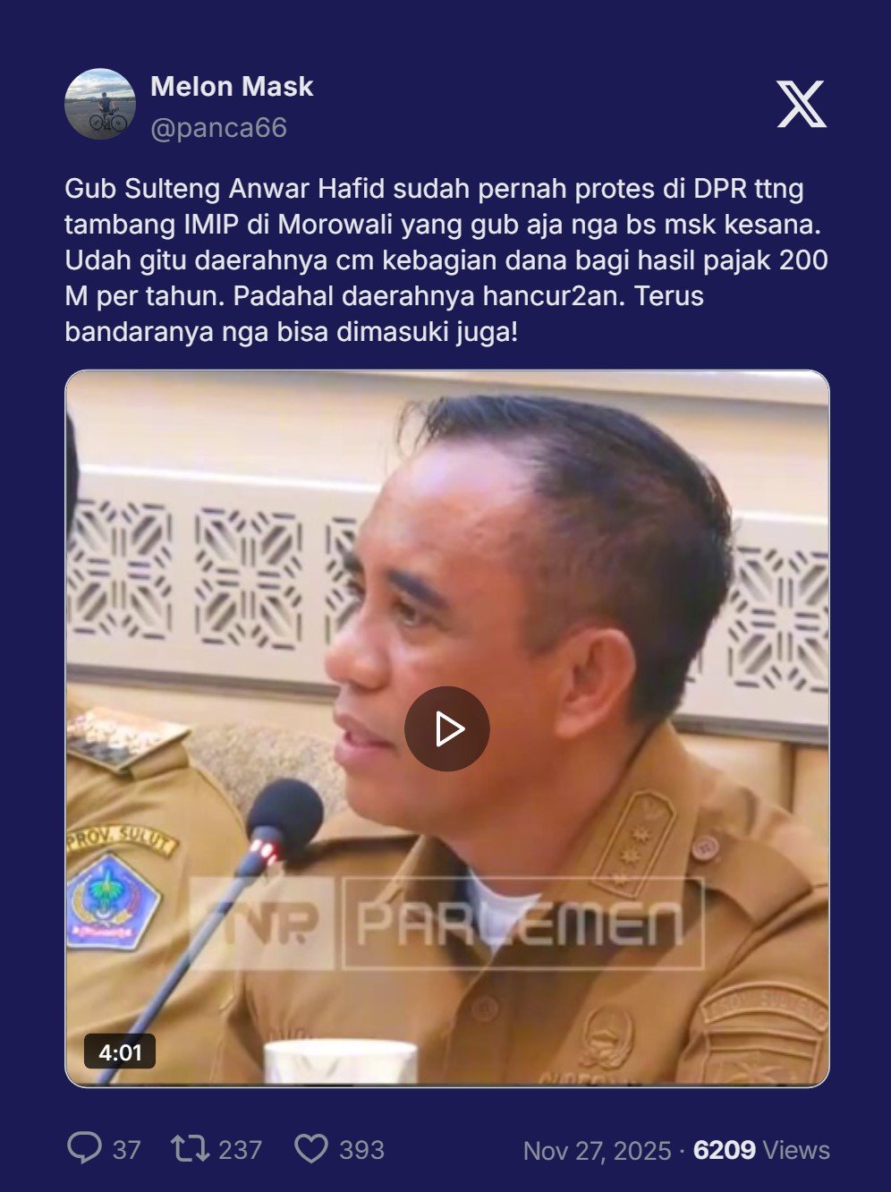 Gubernur Sulawesi Tengah (Sulteng) Anwar Hafid sudah pernah protes di DPR tentang tambang IMIP di Morowali yang gubernur saja tidak bisa masuk kesana. Udah gitu daerahnya cuma kebagian dana bagi hasil pajak 200 M per tahun. Padahal daerahnya hancur-hancuran akibat tambang. Terus Bandaranya nga bisa dimasuki juga!