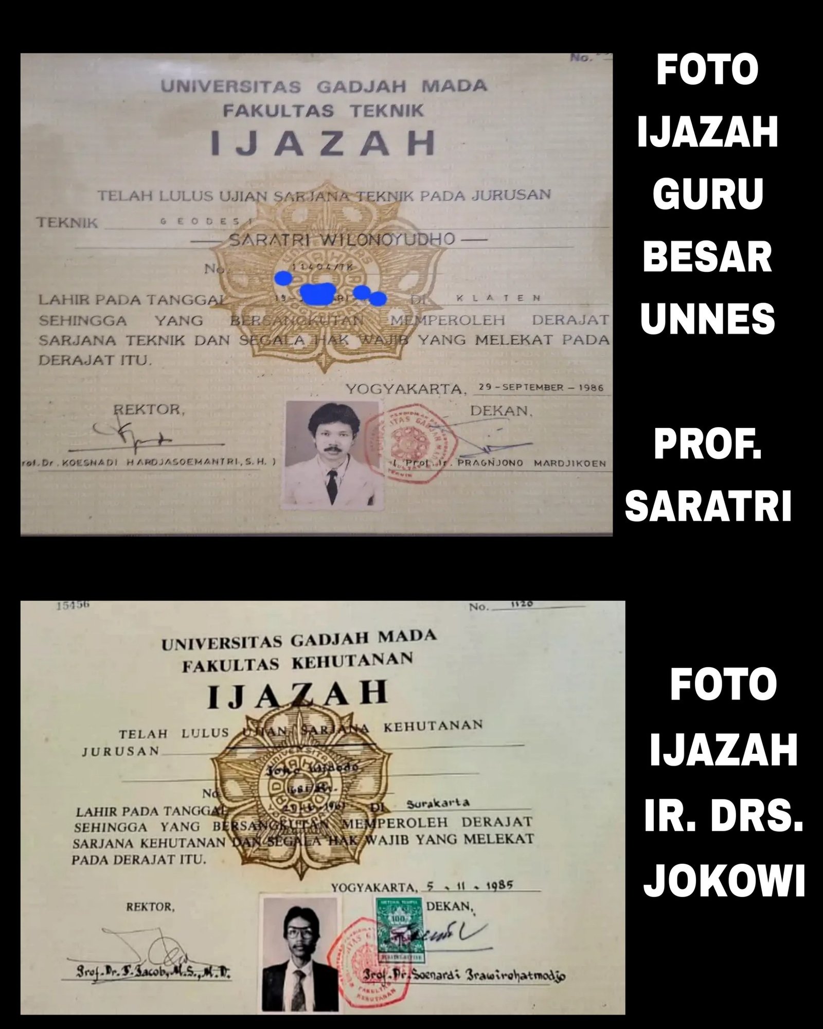 “Punya saya tidak ada materai, dan dulu tidak diperkenankan mengenakan kacamata dalam foto ijazah. Selain itu, jenis font-nya juga berbeda. Tapi apakah ini karena kebijakan fakultas yang berbeda, saya tidak tahu pasti,” ujar Saratri.