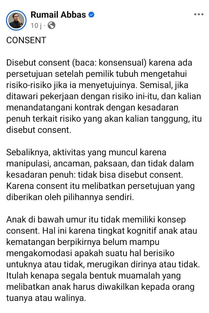 Anak di bawah umur itu tidak memiliki konsep consent. Hal ini karena tingkat kognitif anak atau kematangan berpikirnya belum mampu mengakomodasi apakah suatu hal berisiko untuknya atau tidak, merugikan dirinya atau tidak. Itulah kenapa segala bentuk muamalah yang melibatkan anak harus diwakilkan kepada orang tuanya atau walinya.