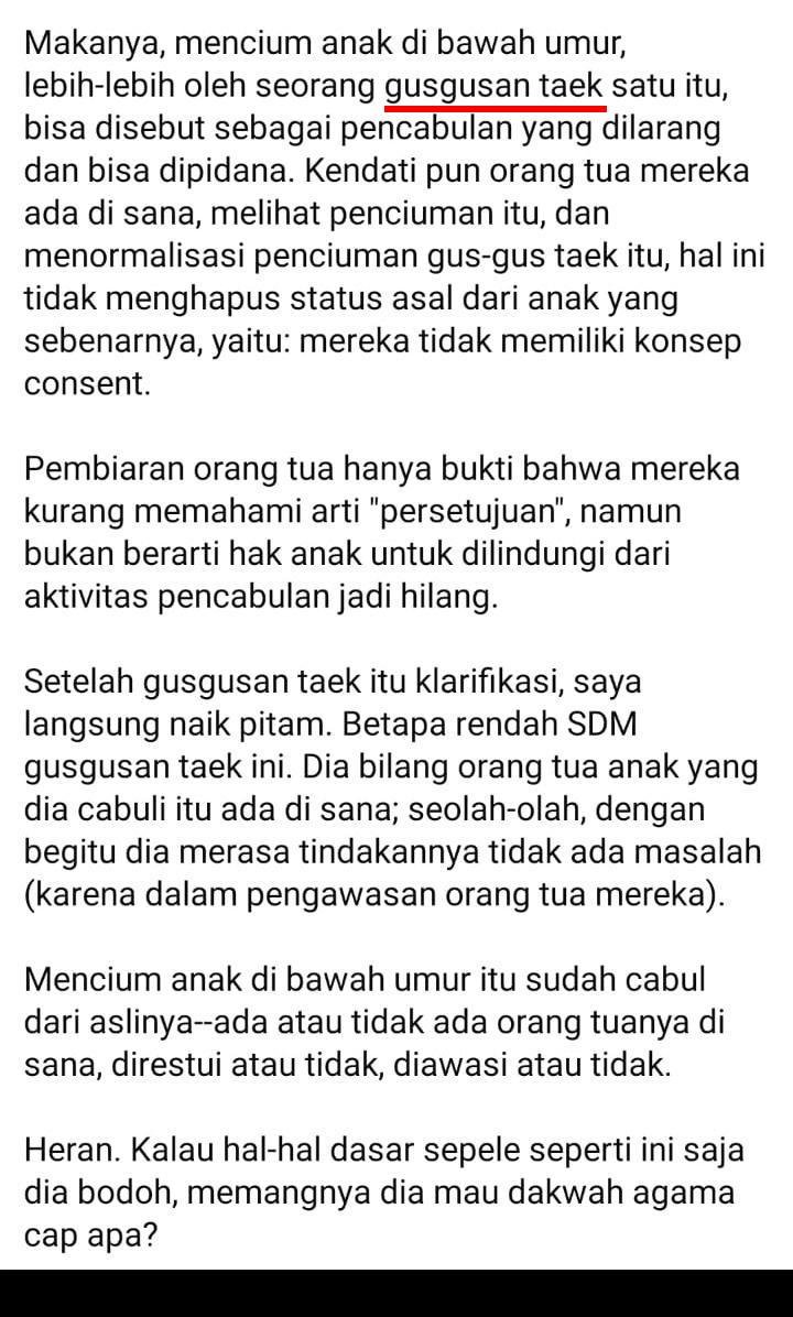 Makanya, mencium anak di bawah umur, lebih-lebih oleh seorang gusgusan taek satu itu, bisa disebut sebagai pencabulan yang dilarang dan bisa dipidana. Kendati pun orang tua mereka ada di sana, melihat penciuman itu, dan menormalisasi penciuman gus-gus taek itu, hal ini tidak menghapus status asal dari anak yang sebenarnya, yaitu: mereka tidak memiliki konsep consent.
