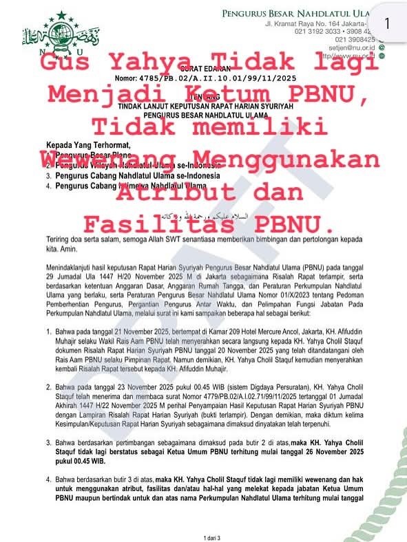 “Bahwa berdasarkan butir 3 di atas, maka KH Yahya Cholil Staquf tidak lagi memiliki wewenang dan hak untuk menggunakan atribut, fasilitas, dan/atau hal-hal yang melekat kepada jabatan Ketua Umum PBNU maupun bertindak untuk dan atas nama Perkumpulan Nahdlatul Ulama terhitung mulai tanggal 26 November 2025 pukul 00.45 WIB,” lanjut keterangan keputusan.