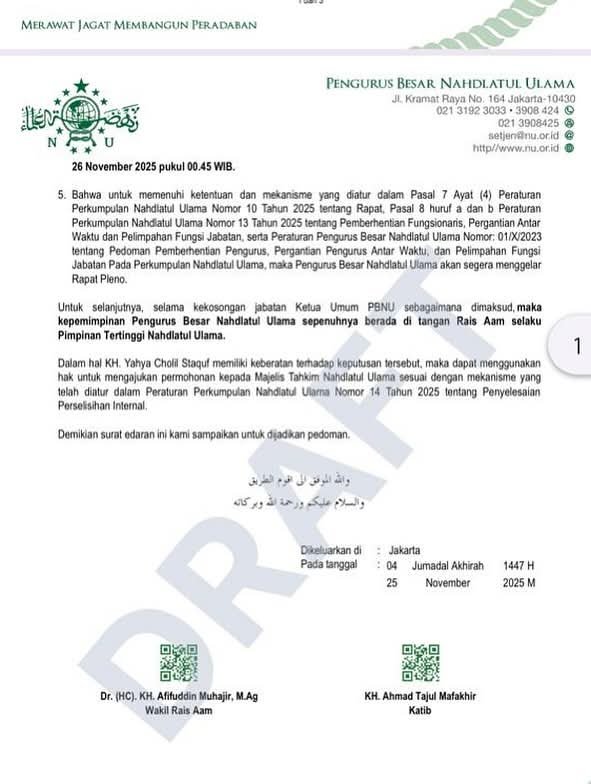 Hal tersebut tertuang dalam surat edaran PBNU tentang tindak lanjut keputusan rapat harian Syuriyah PBNU yang diteken Wakil Rais Aam PBNU Afifuddin Muhajir dan Katib Ahmad Tajul Mafakhir pada Selasa, 25 November 2025.