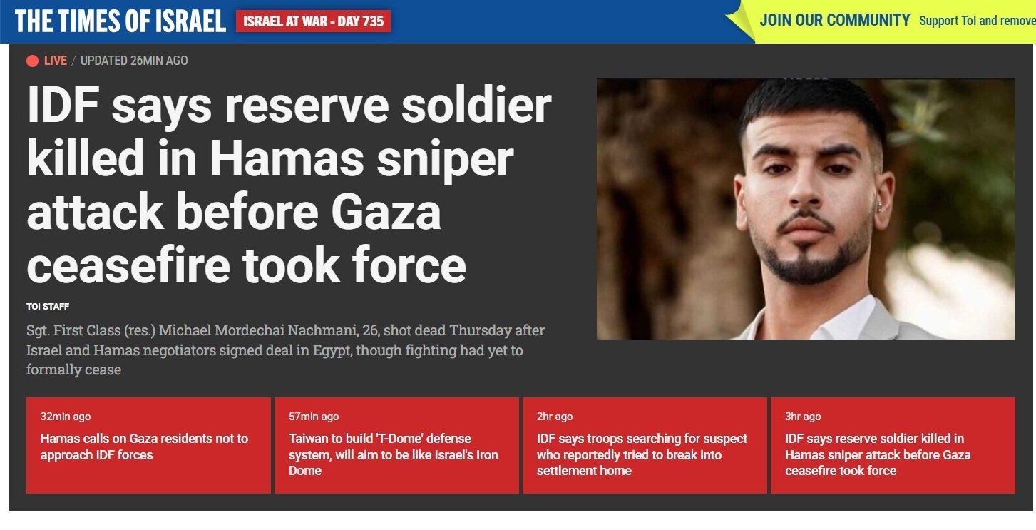 - Sersan Satu (Purn.) Michael Mordechai Nachmani, 26, ditembak mati pada hari Kamis sore (9/10/2025) setelah negosiator Israel dan Hamas menandatangani kesepakatan di Mesir, meskipun pertempuran belum resmi berakhir.
