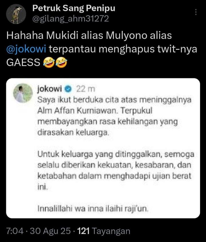 Mantan Presiden RI Joko Widodo terpantau menghapus twitnya yang berisi ucapan belasungkawa atas meninggalnya Affan Kurniawan driver ojol yang tewas dilindas mobil lapas baja Brimob.