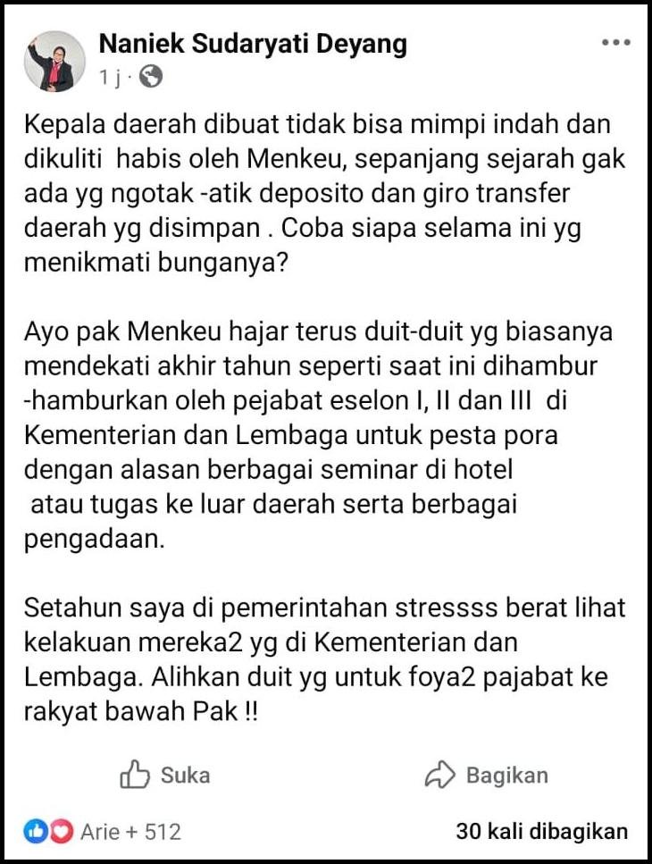 “Kepala daerah dibuat tidak bisa mimpi indah dan dikuliti habis oleh Menkeu, sepanjang sejarah gak ada yg ngotak-atik deposito dan giro transfer daerah yg disimpan. Coba siapa selama ini yg menikmati bunganya?