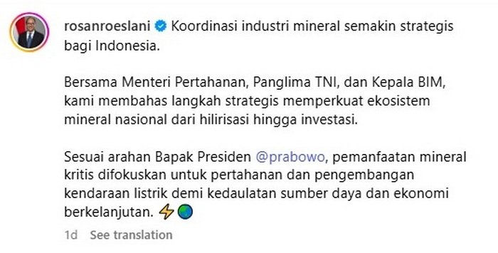 “Sesuai arahan Bapak Presiden @prabowo, pemanfaatan mineral kritis difokuskan untuk pertahanan dan pengembangan kendaraan listrik demi kedaulatan sumber daya dan ekonomi berkelanjutan. ⚡🌏,” ujarnya.
