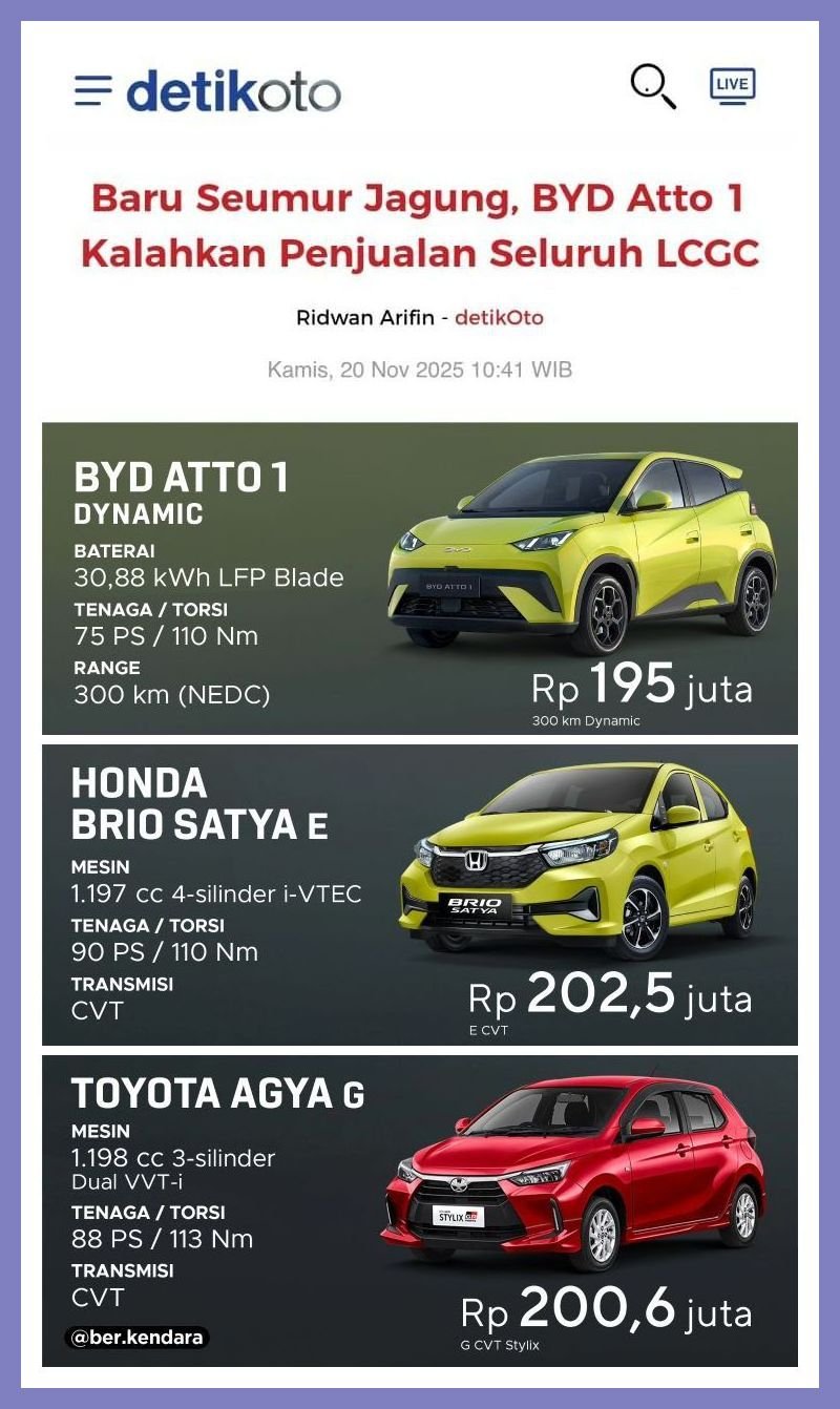 Terakhir, kenapa postingan ini pakai screenshot berita ini? Karena itulah buah dari 110.000 insyinur BYD. Dan hasilnya fantastis! Totalkan penjualan Ayla, Agya, Calya, Brio, Sigra, bulan Oktober ini, semuanya kalah telak dibanding Atto 1 BYD.