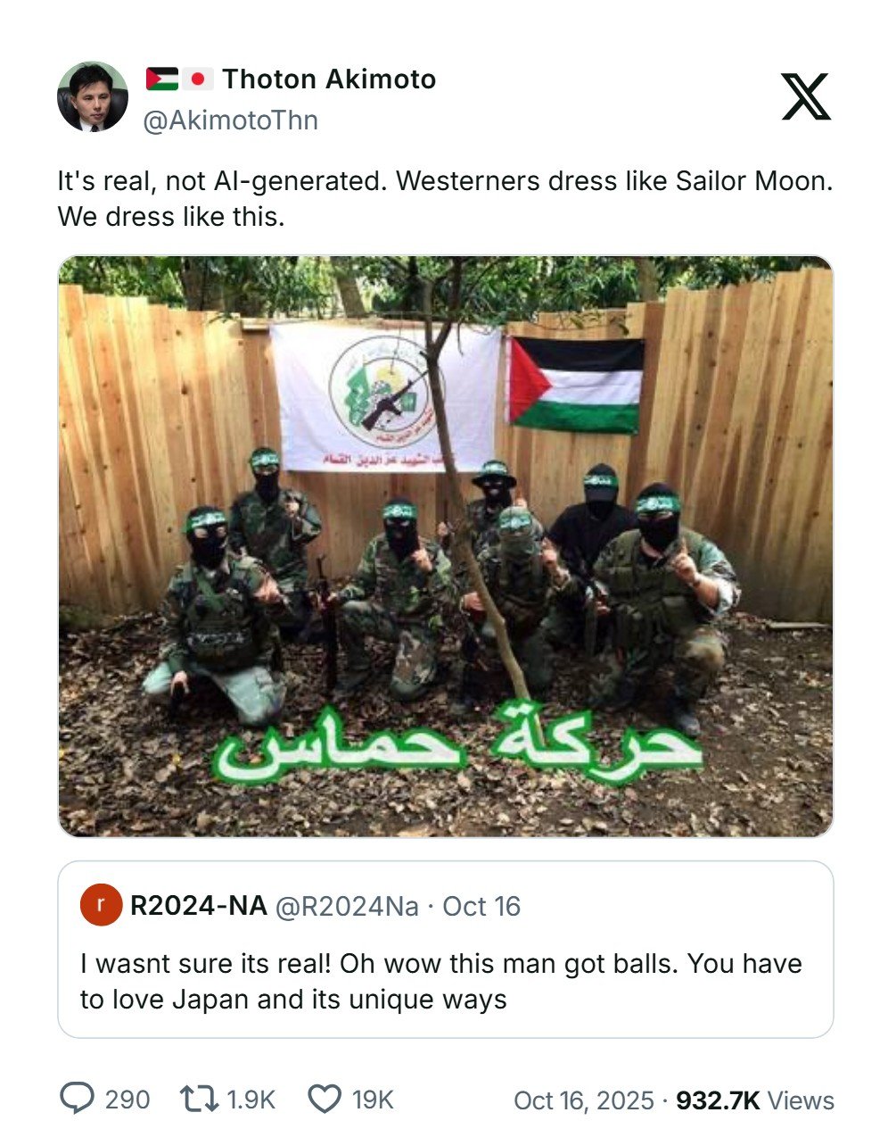 Beberapa foto dan video dibagikan secara daring yang memperlihatkan warga negara Jepang mengenakan perlengkapan kamuflase militer lengkap, di samping ikat kepala hijau khas pejuang Hamas.