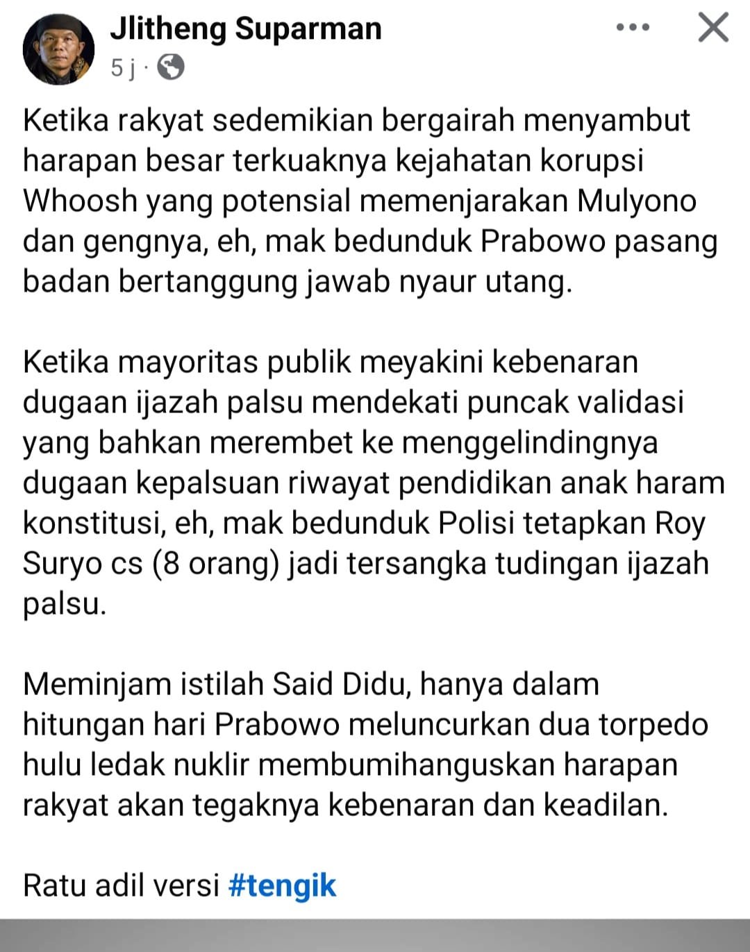 Ketika mayoritas publik meyakini kebenaran dugaan ijazah palsu mendekati puncak validasi yang bahkan merembet ke menggelindingnya dugaan kepalsuan riwayat pendidikan anak haram konstitusi, eh, mak bedunduk Polisi tetapkan Roy Suryo cs (8 orang) jadi tersangka tudingan ijazah palsu.