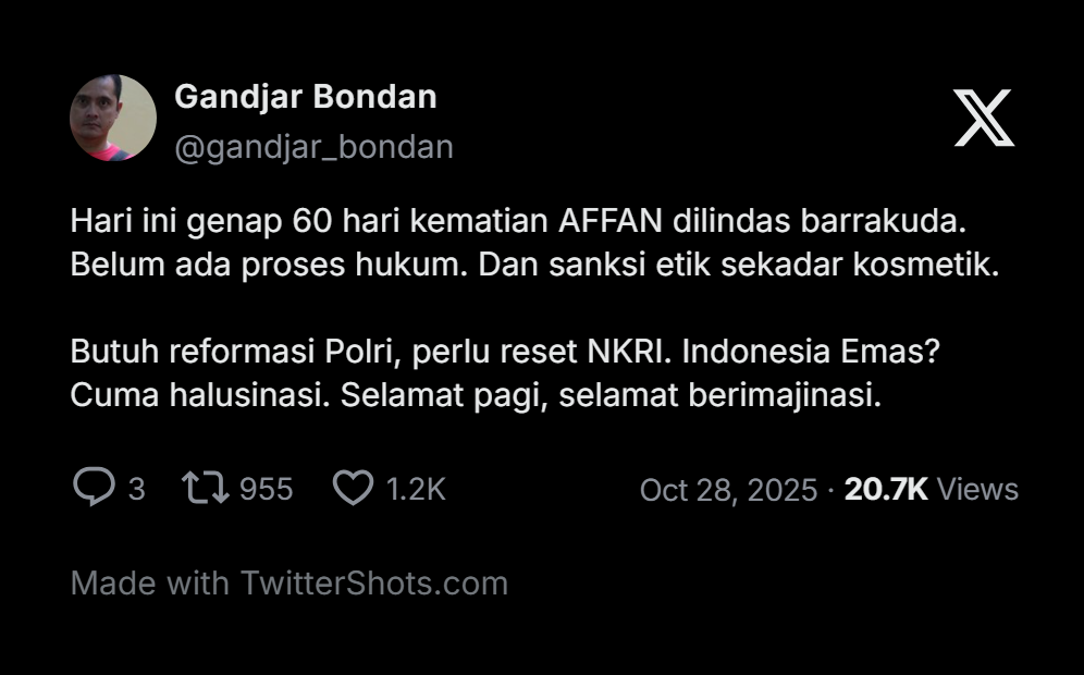 Hari ini genap 60 hari kematian AFFAN dilindas barrakuda. Belum ada proses hukum. Dan sanksi etik sekadar kosmetik.