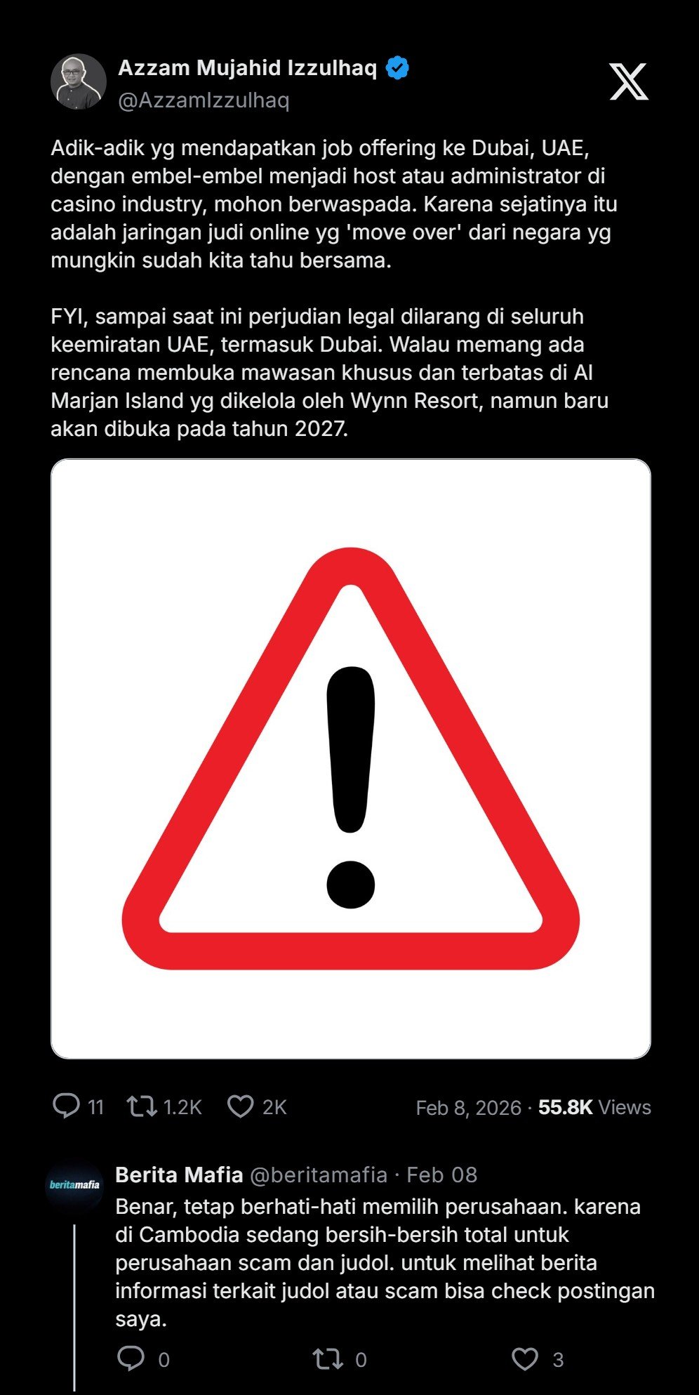 Adik-adik yang mendapatkan job offering (tawaran kerja) ke Dubai, UAE, dengan embel-embel menjadi host atau administrator di casino industry, mohon berwaspada. Karena sejatinya itu adalah jaringan judi online yang ‘move over’ (pindah) dari negara yang mungkin sudah kita tahu bersama (Kamboja -red).
