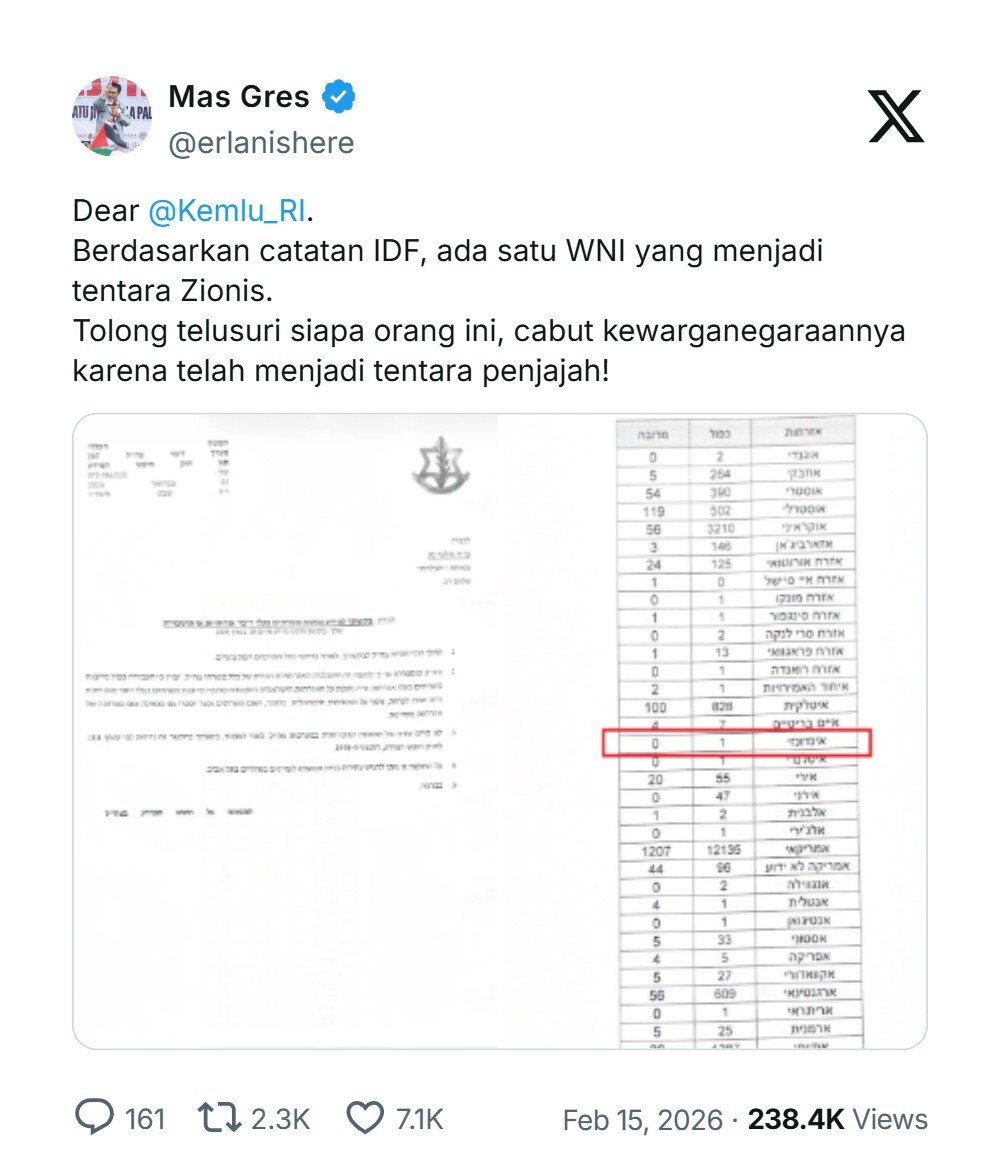 Terkait WNI yang masuk daftar IDF, sudah ditanyakan aktivis Pro-Palestina Mas Gres @erlanishere ke Kementerian Luar Negeri RI.