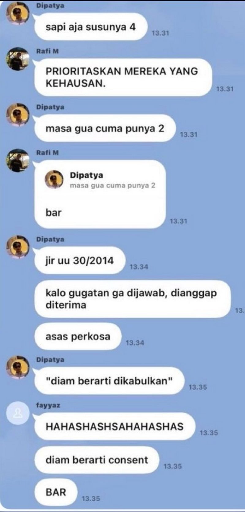Dari tangkapan layar yang beredar seperti dilihat, Senin (13/4/2026), terlihat percakapan bernada pelecehan seksual dari beberapa orang yang diduga mahasiswa Fakultas Hukum UI. Di grup tersebut, mereka menyinggung-nyinggung mahasiswi lain.