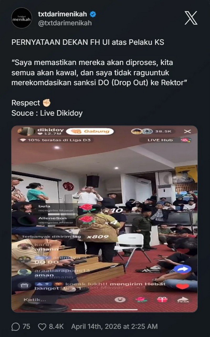 “Fakultas mengecam keras segala bentuk perilaku yang merendahkan martabat manusia serta bertentangan dengan nilai hukum dan etika akademik,” pernyataan Fakultas Hukum UI.
