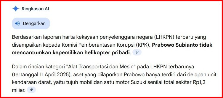 Merujuk berita CNBC Indonesia (25 Juli 2025) yang didasarkan pada Laporan Harta Kekayaan Penyelenggara Negara (LHKPN), tidak tercatat Prabowo Subianto memiliki helikopter.
