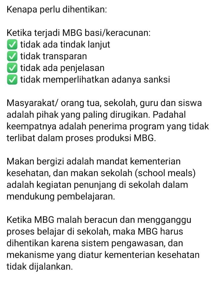 Ketika MBG malah beracun dan mengganggu proses belajar di sekolah, maka MBG harus dihentikan karena sistem pengawasan, dan mekanisme yang diatur kementerian kesehatan tidak dijalankan.