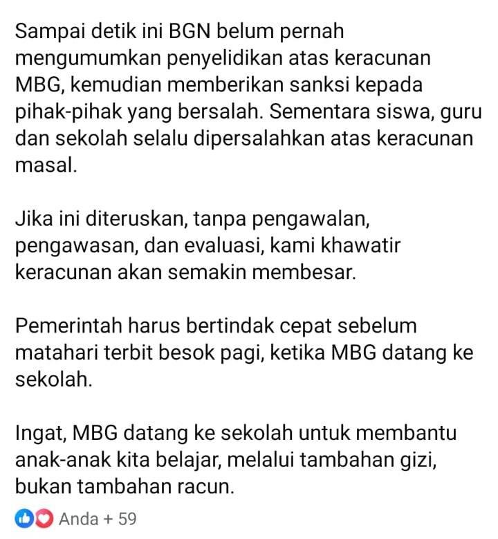 Ingat, MBG datang ke sekolah untuk membantu anak-anak kita belajar, melalui tambahan gizi, bukan tambahan racun.