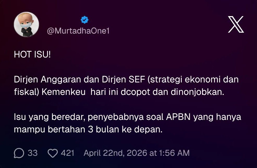 Berdasarkan informasi per 22 April 2026, Menteri Keuangan Purbaya Yudhi Sadewa dikabarkan telah mencopot dua Pejabat Eselon I di Kementerian Keuangan. Pejabat Eselon I adalah pejabat level paling atas dibawah Menteri.