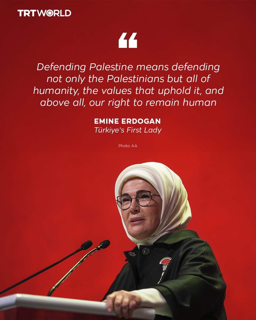 “Membela Palestina berarti membela bukan hanya warga Palestina tetapi seluruh umat manusia, nilai-nilai yang menjunjungnya, dan yang terpenting, hak kita untuk tetap menjadi manusia,” tambah Emine Erdogan.