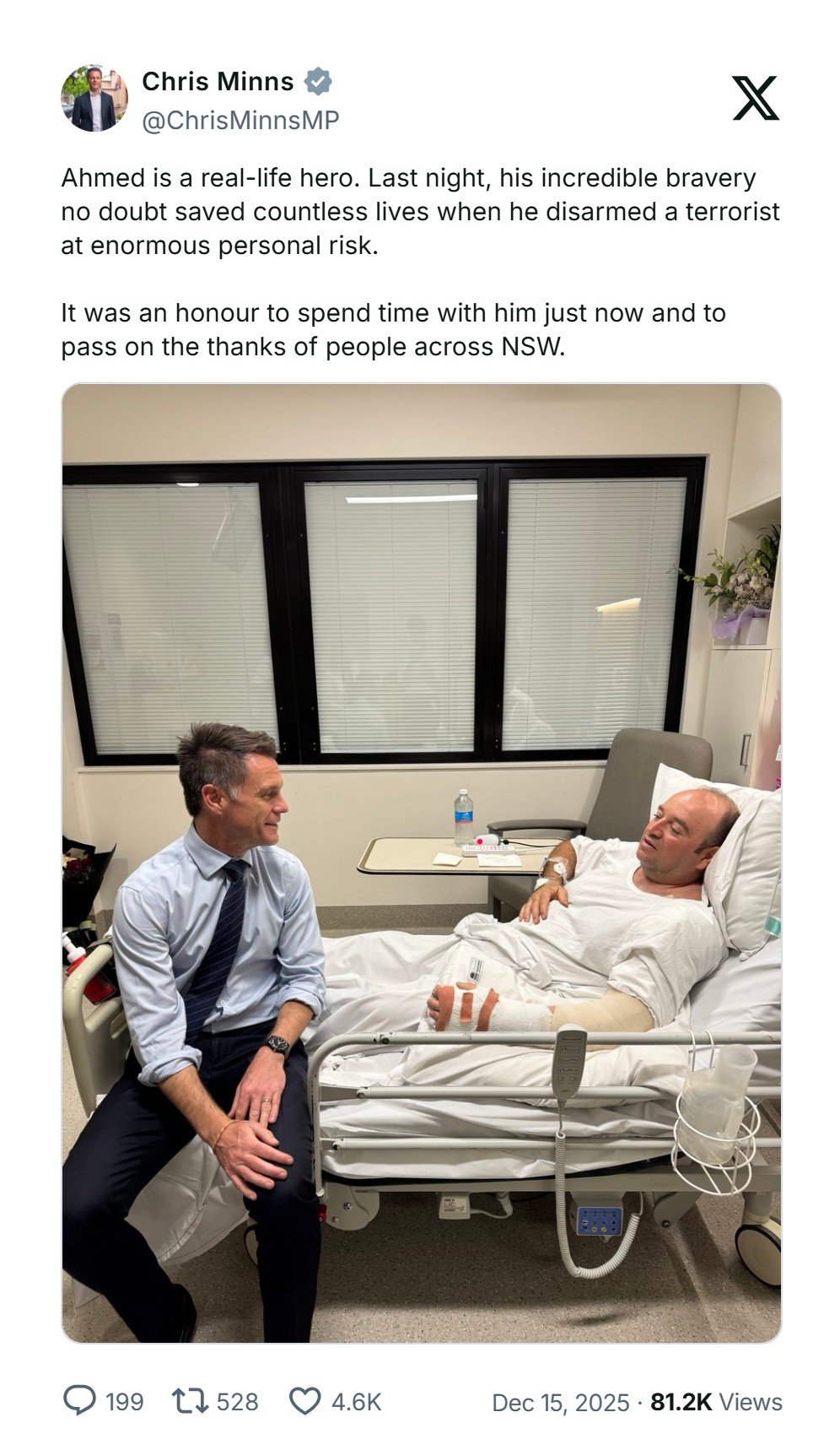 Hal ini disampaikan Chris Minns saat menjenguk Ahmed yang sedang dirawat di Rumah Sakit akibat terkena dua kali tembakan saat merampas senjata penyerang.