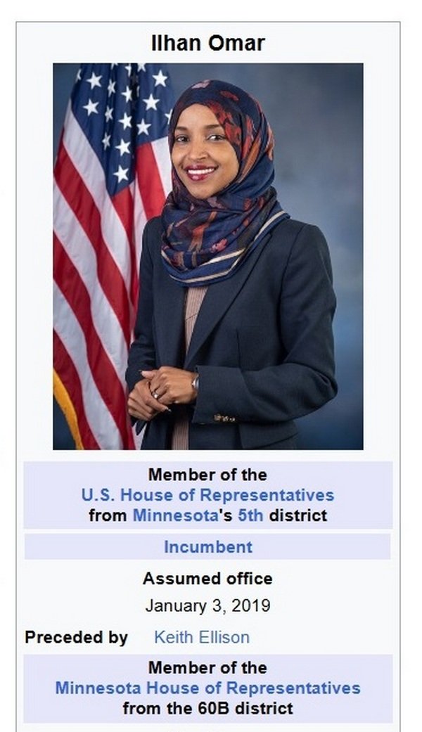 Ilhan Omar adalah anggota Dewan Perwakilan Rakyat (DPR) Amerika Serikat yang mewakili Distrik Kongres ke-5 Minnesota. Ia berasal dari Somalia (imigran). Ia merupakan salah satu dari dua wanita Muslim pertama yang terpilih menjadi anggota Kongres dan mantan pengungsi Afrika pertama yang menjabat di badan legislatif tersebut.