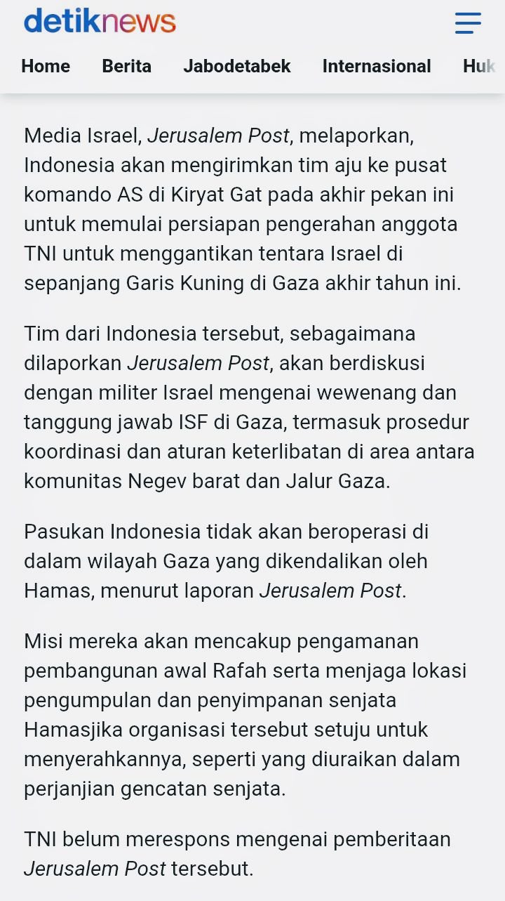Media Israel, Jerusalem Post, melaporkan, Indonesia akan mengirimkan tim aju ke pusat komando AS di Kiryat Gat pada akhir pekan ini untuk memulai persiapan pengerahan anggota TNI untuk menggantikan tentara Israel di sepanjang Garis Kuning (yellow line) di Gaza akhir tahun ini.
