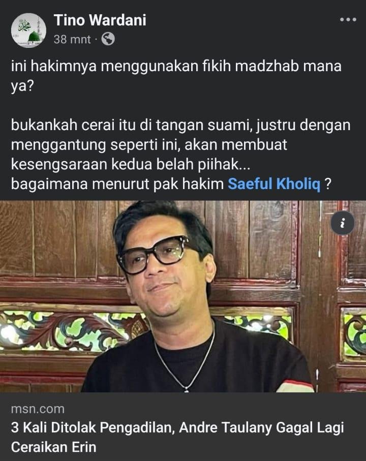 Tino Wardani: “ini hakimnya menggunakan fikih madzhab mana ya? bukankah cerai itu di tangan suami, justru dengan menggantung seperti ini, akan membuat kesengsaraan kedua belah piihak⦔
