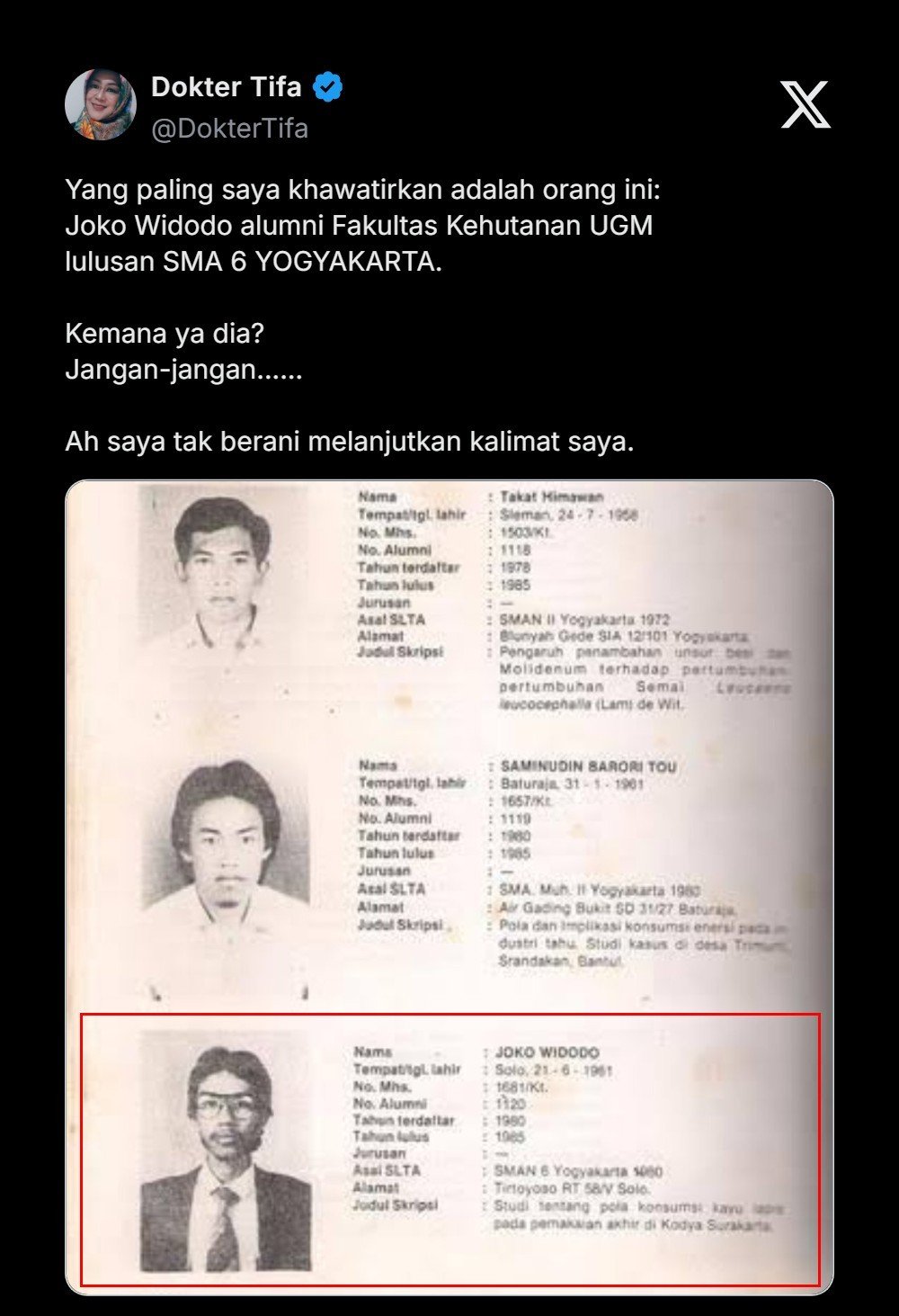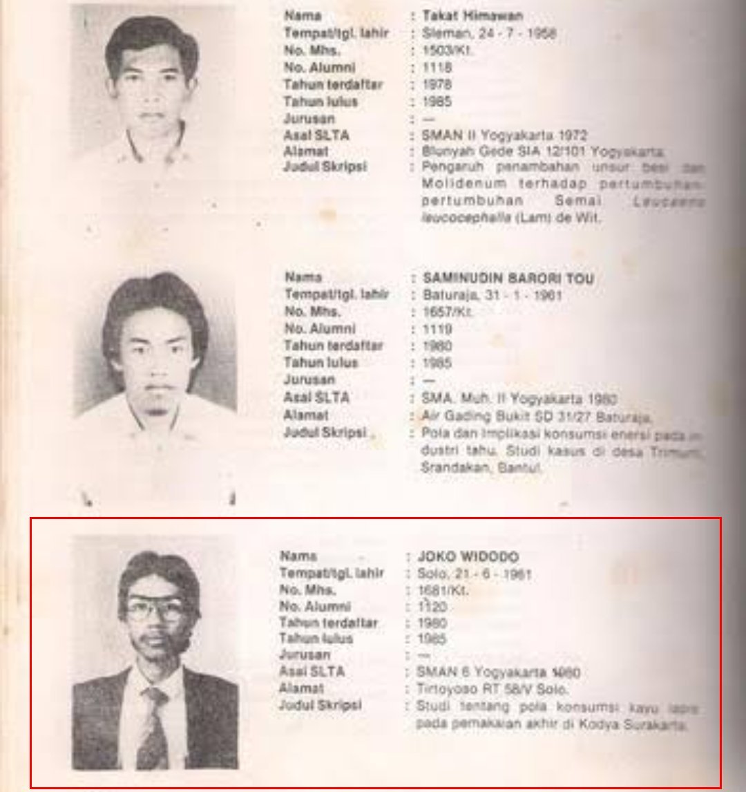 Beliau ini Alumni SMA 6 Yogyakarta, merujuk dari buku Alumni yang beredar banyak di internet dan menjadi salah satu barang bukti di Sidang CLS – Citizen Law Suit – di Solo.