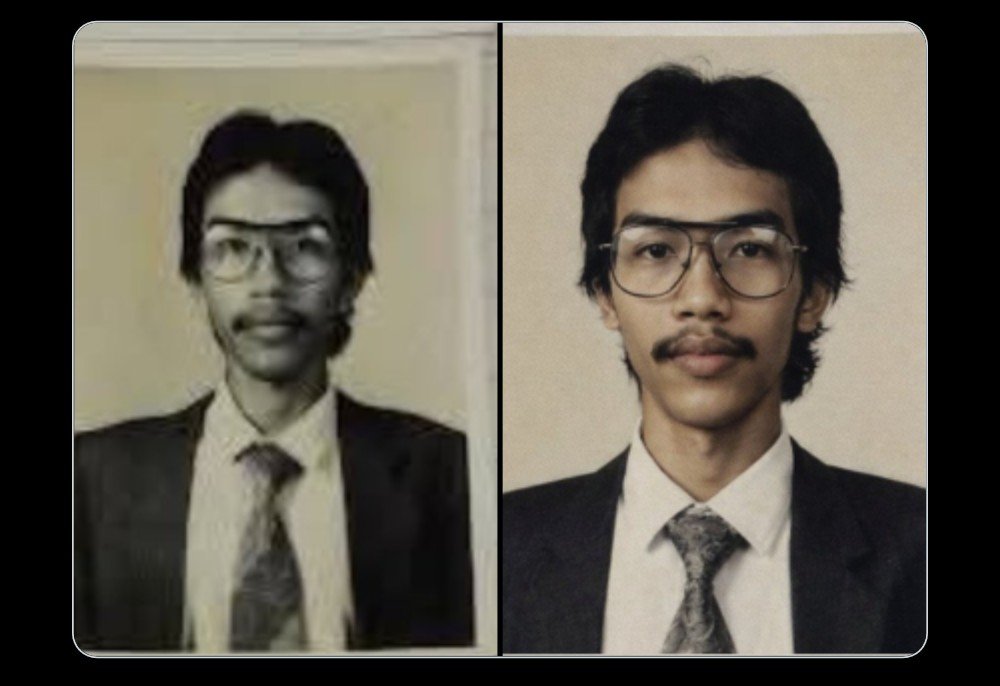 Ketika foto ini diperjelas dengan teknologi, semakin jelas rambutnya yang belah tengah, bentuk kacamata minusnya, sorot mata cerdas, hidung mancung, kumis, bibir tebal, dagu lancip.
