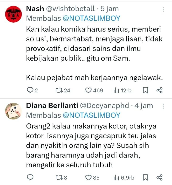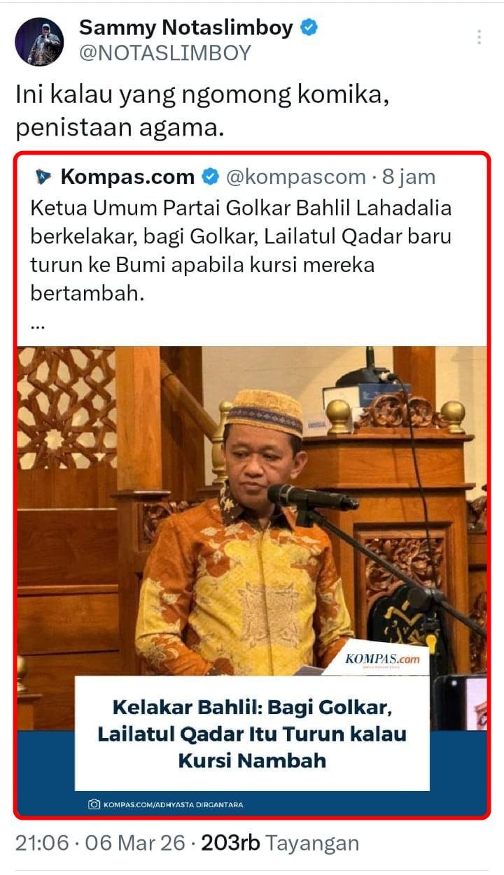 “Ini kalau yang ngomong komika, penistaan agama,” sentil Sammy Notaslimboy @NOTASLIMBOY.