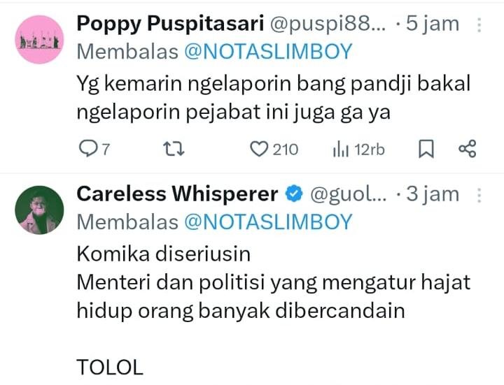 “Yg kemarin ngelaporin bang pandji bakal ngelaporin pejabat ini juga ga ya,” timpal @puspi88890.