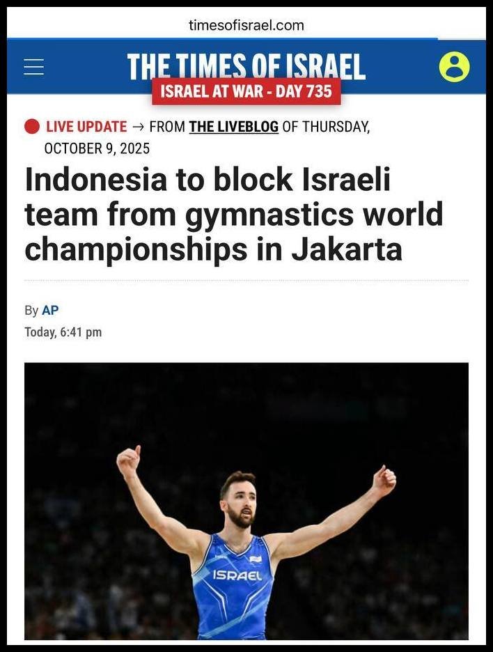 Salah satu media Israel THE TIMES OF ISRAEL mengangkat berita pelarangan atlet senam Israel di Indonesia.
