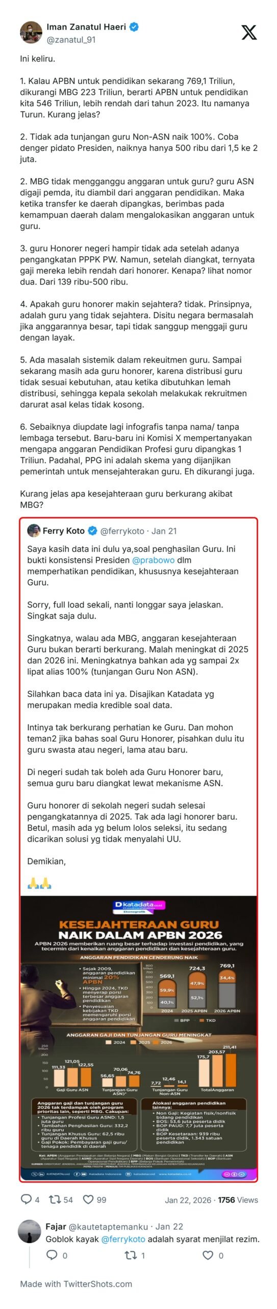 Kepala Bidang Advokasi Guru P2G, Iman Zanatul Haeri menanggapi postingan pendukung Rezim soal MBG dan Anggaran Pendidikan.