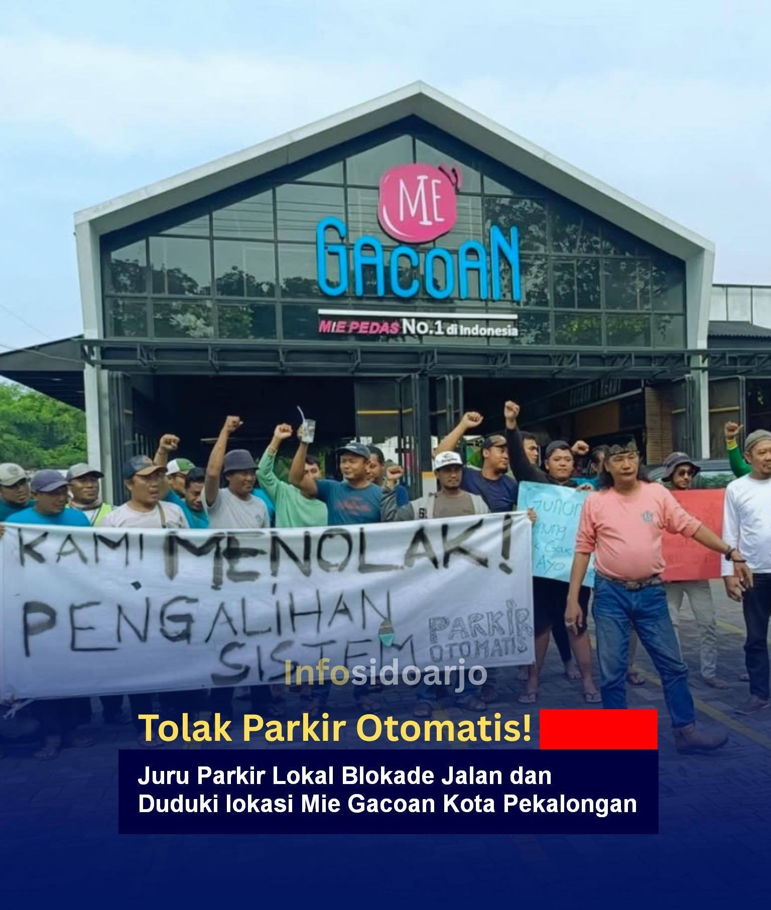 Juru parkir lokal di Mie Gacoan Jalan Imam Bonjol, Kota Pekalongan, menolak sistem parkir vendor (e-parking) dan bertahan menduduki area lokasi, Sabtu (11/4/2026). Aksi ini dipicu kekhawatiran hilangnya mata pencaharian warga setempat, menyebabkan blokade akses dan kebuntuan mediasi antara warga dan manajemen.