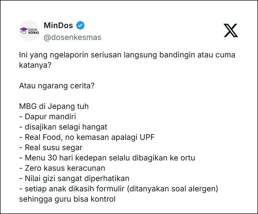 đŸ‘‰Presiden Prabowo mendapat laporan bahwa kualitas program Makan Bergizi Gratis (MBG) di Indonesia lebih baik ketimbang program serupa di Jepang dan negara-negara Eropa.