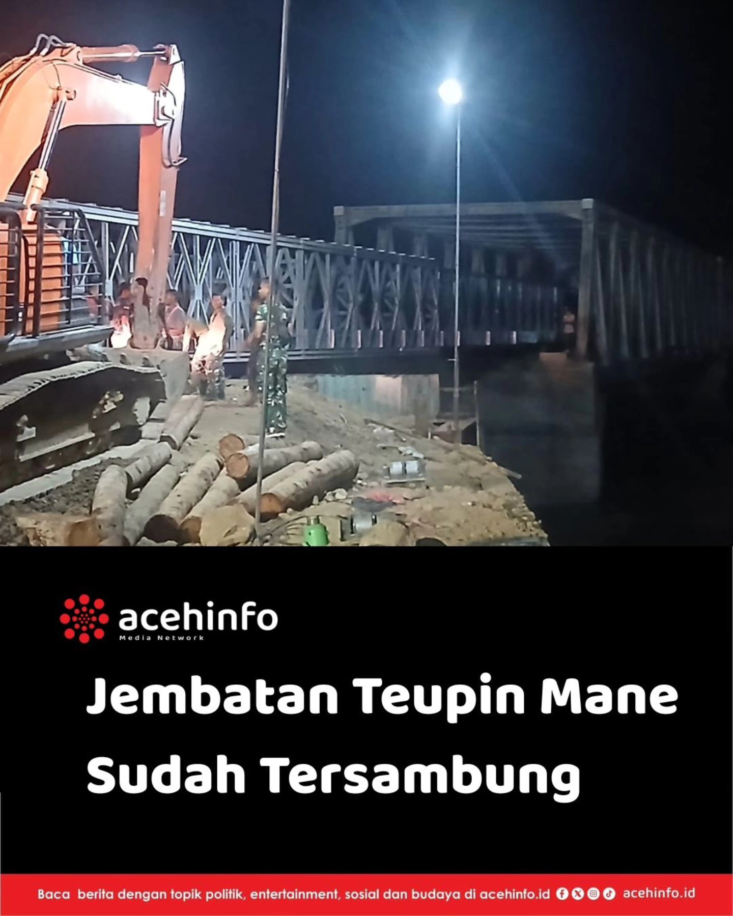 Jembatan Teupin Mane (Jembatan Penghubung Bireuen-Bener Meriah) yang sebelumnya terputus akibat bencana kini telah berhasil tersambung pada sore hari ini, Jumat (12/12/2025). Tersambungnya jembatan tersebut disambut positif oleh masyarakat karena kembali membuka akses transportasi dan mobilitas warga.