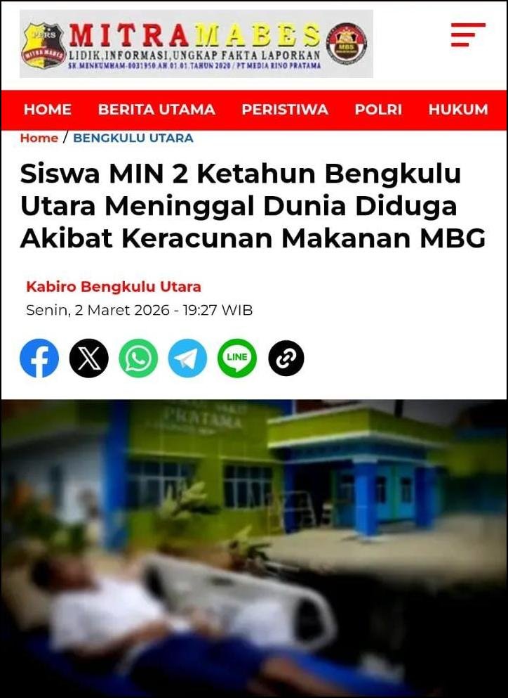 Siswa Madrasah Ibtidaiyah Negeri 2 Bengkulu Utara yang diduga Keracunan Paket MBG dari Dapur SPPG Giri Kencana, meninggal dunia pada Sabtu malam, 28 Februari 2026.