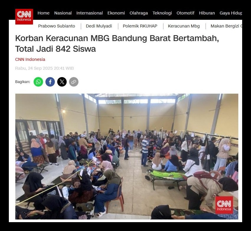 Dinas Kesehatan Jawa Barat mencatat korban keracunan makan bergizi gratis (MBG) di Kecamatan Cipongkor dan Cihampelas, Bandung Barat, dalam dua hari terakhir mencapai 842 siswa dari sejumlah sekolah.