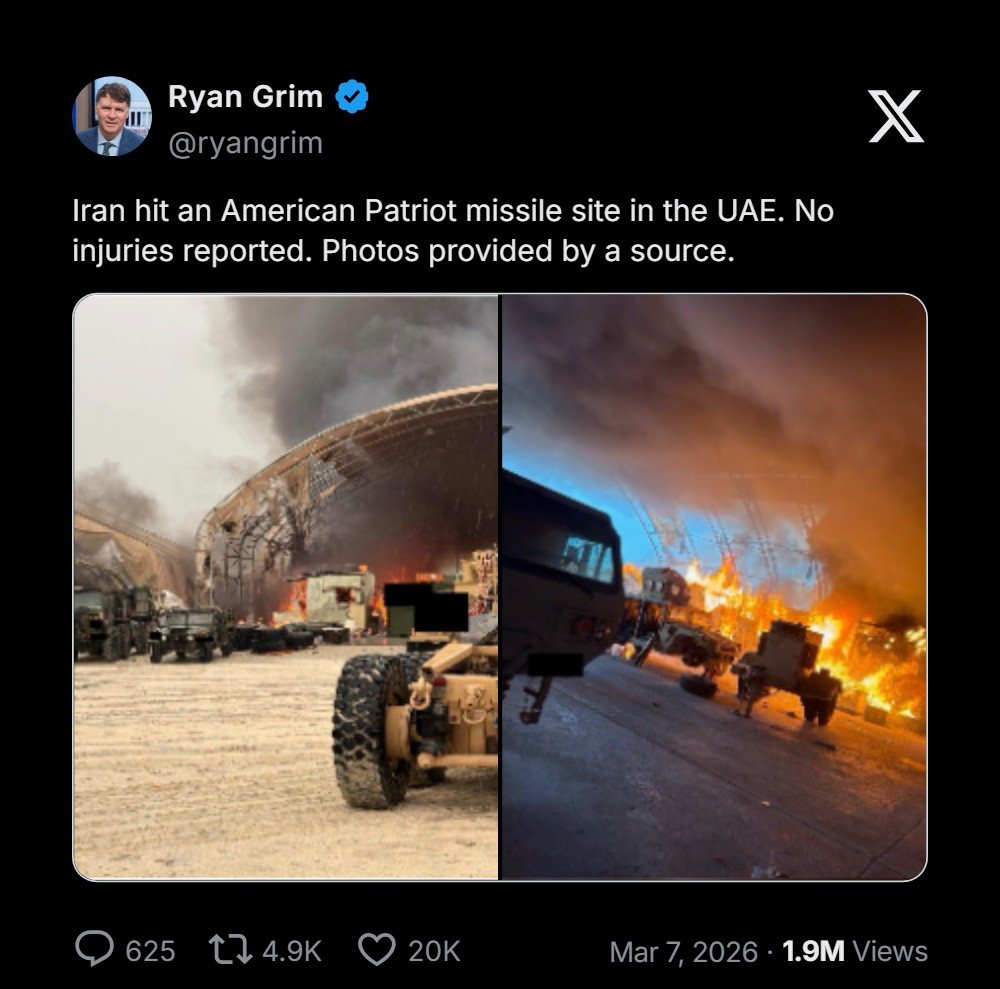 Laporan terkini mengonfirmasi bahwa Militer Iran telah melakukan serangan terhadap situs pertahanan udara Patriot milik Amerika Serikat di Uni Emirat Arab (UEA) pada 7 Maret 2026.