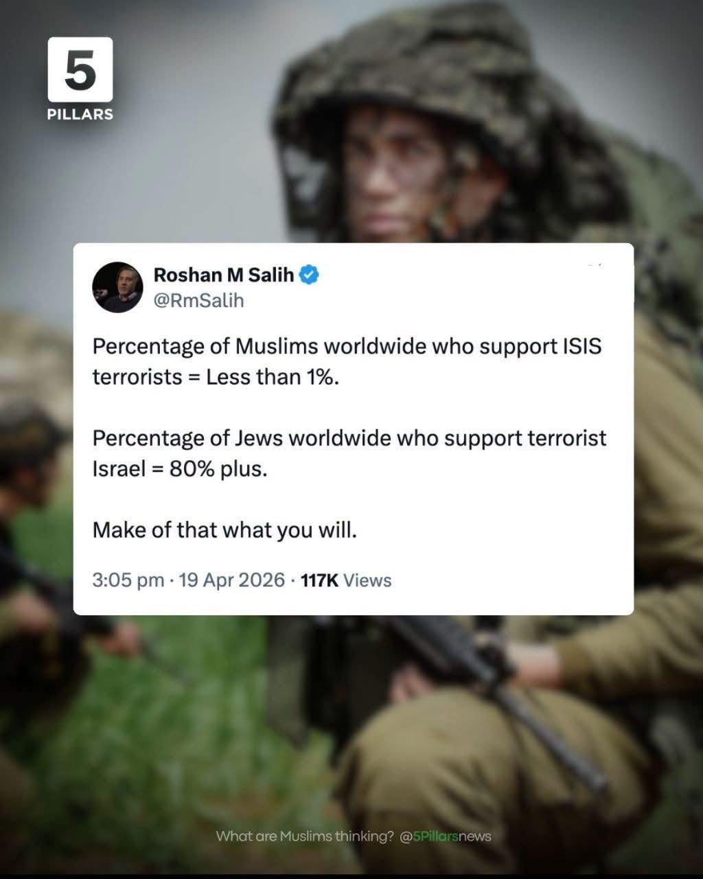 Persentase Yahudi di seluruh dunia yang mendukung negara teroris Israel = Lebih dari 80%.