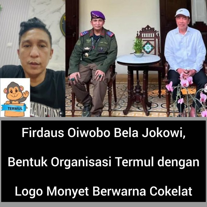 Viral di media sosial X sebuah foto yang memperlihatkan Firdaus Oiwobo (Ketum Termul yang dijuluki netizen “jenderal bintang lima” π ) bertemu mantan Presiden ke-7 RI Joko Widodo alias Jokowi.