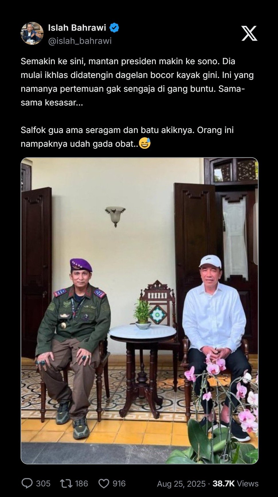 “Semakin ke sini, mantan presiden makin ke sono. Dia mulai ikhlas didatengin dagelan bocor kayak gini,β tulis Islah.
