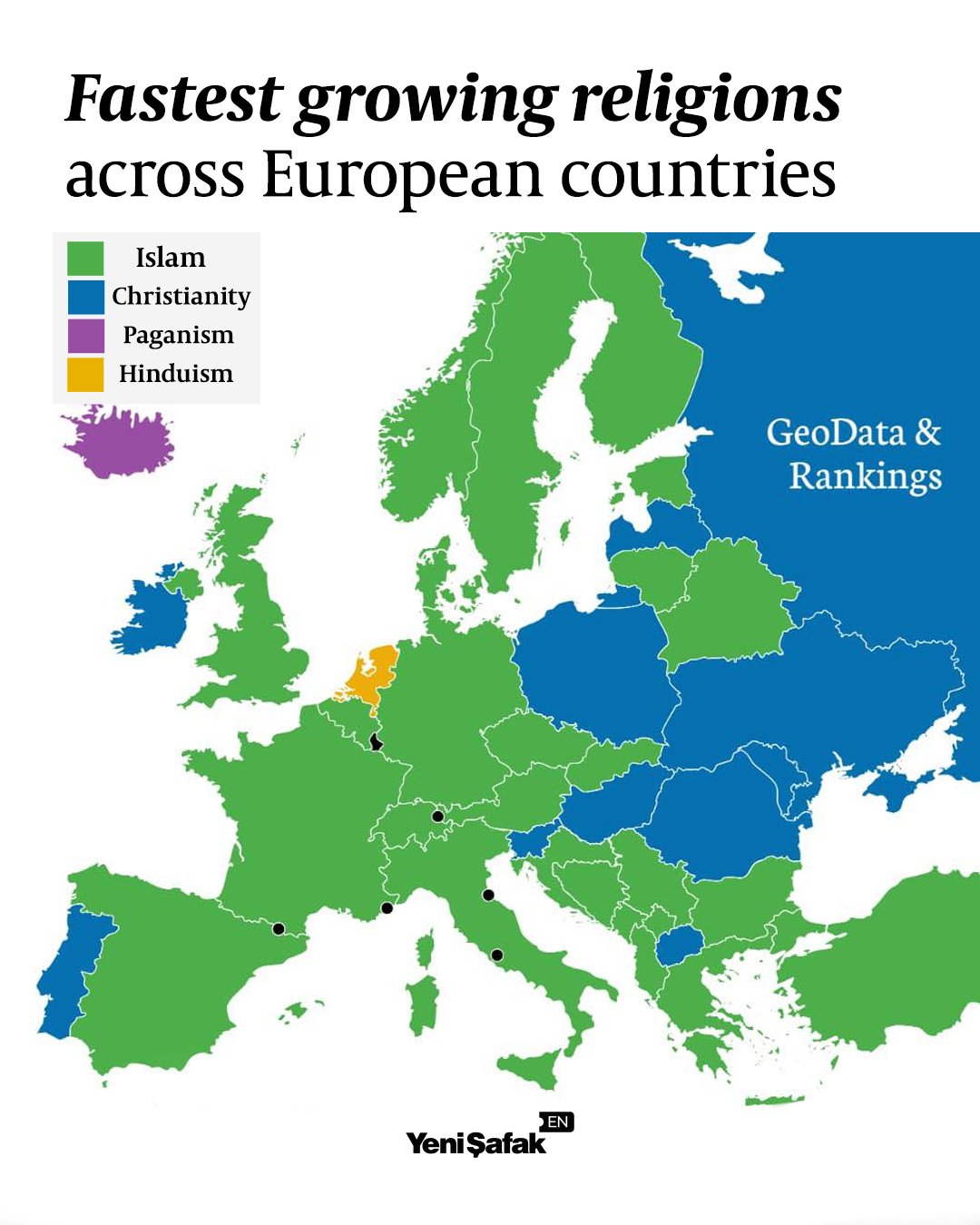 Peta ini menyoroti agama yang paling cepat berkembang di setiap negara Eropa, berdasarkan tren demografis terkini dan bukan mayoritas secara keseluruhan. Pertumbuhan dipengaruhi oleh faktor-faktor seperti migrasi, tingkat konversi, tingkat kelahiran, dan perubahan identifikasi keagamaan.