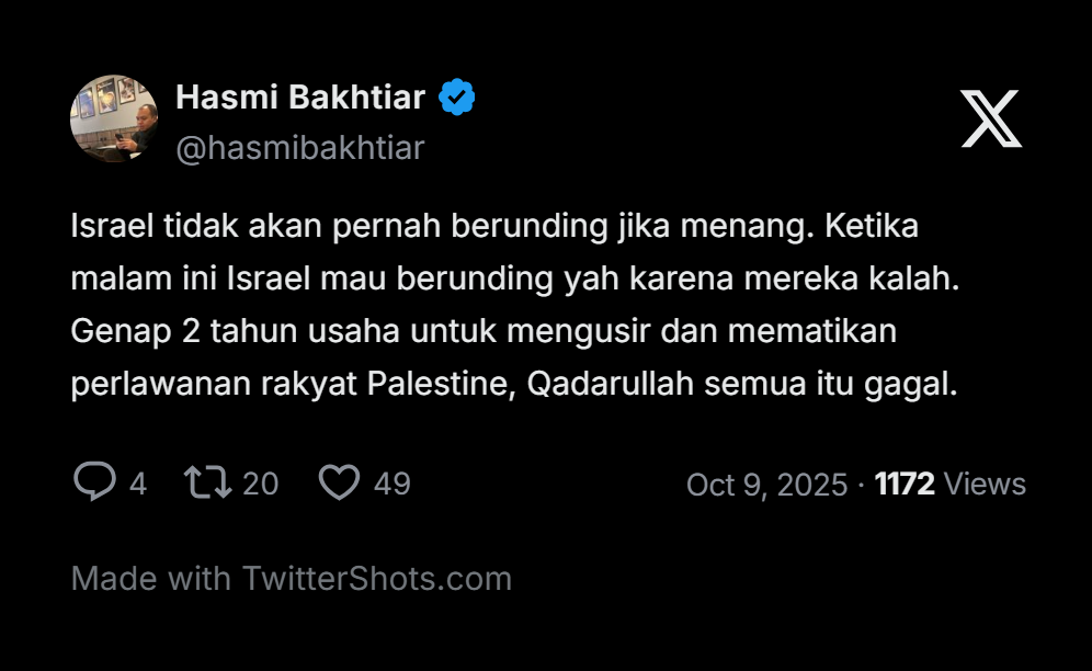 “Israel tidak akan pernah berunding jika menang. Ketika malam ini Israel mau berunding yah karena mereka kalah. Genap 2 tahun usaha untuk mengusir dan mematikan perlawanan rakyat Palestine, Qadarullah semua itu gagal.”