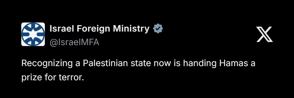 Dalam sebuah unggahan di X, kementerian luar negeri Israel menulis bahwa pengakuan Palestina oleh Inggris sebagai negara “berarti memberi Hamas hadiah atas terornya”.